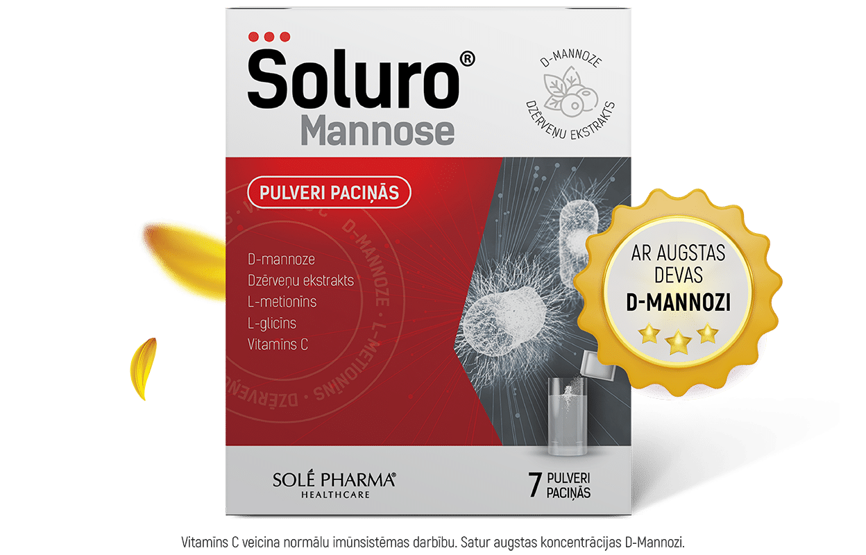 Soluro® Mannose domāta urīnceļiem un  satur augstas koncentrācijas D-Mannozi un ir pirmais D-Mannozes saturošs produkts Latvijā ar augstas koncentrācijas devu.